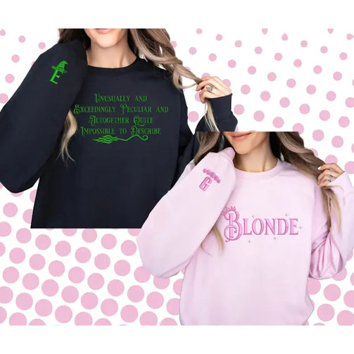 Get ready to defy gravity in style with our Wicked inspired sweatshirt This Gildan sweatshirt, available in light pink and sizes S-3X, is perfect for your next trip to the Broadway or the movies. Embrace your unique and quirky style with this wickedly good sweatshirt. Faux embroidery, printed graphic Wicked the musical wicked wicked the movie